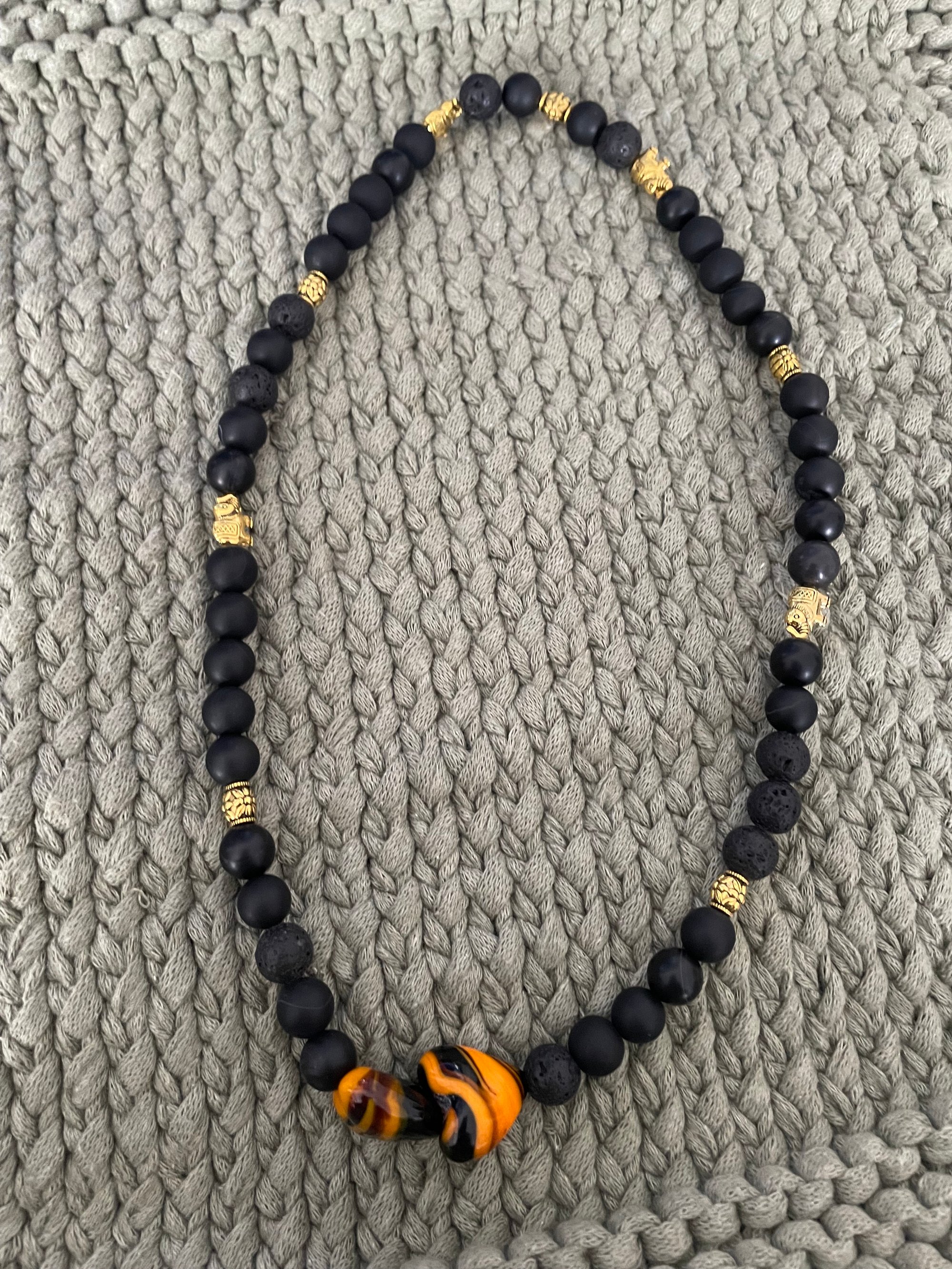 Black and Orange Elastic Beaded Necklace with Heart Charms