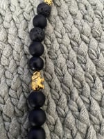This piece is perfect to wear with casual or dressy attire. It is made of black beads, gold-colored decorative beads along with two orange and black large heart charms. Free Shipping.